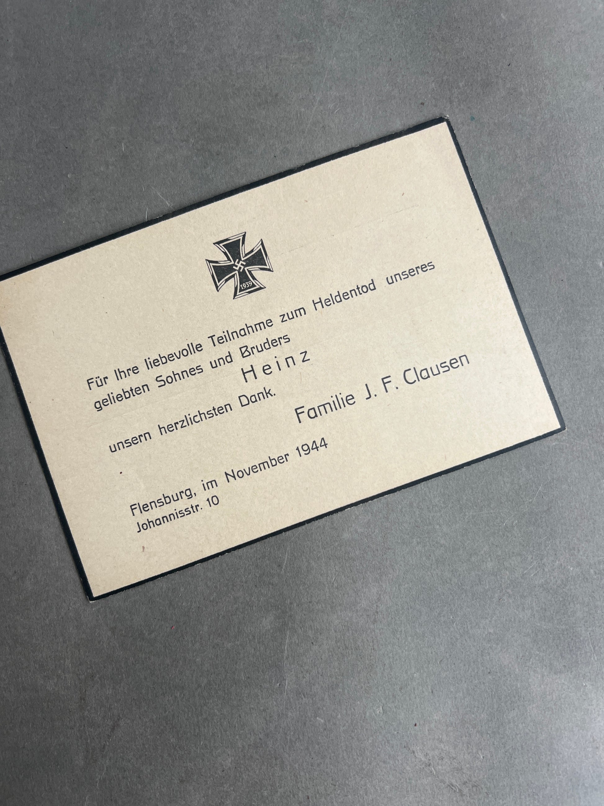 WW2 Tysk "Heldentod" Begravelseskort fra Flensburg. Efternavn "Clausen". Postkort størrelse. Original.