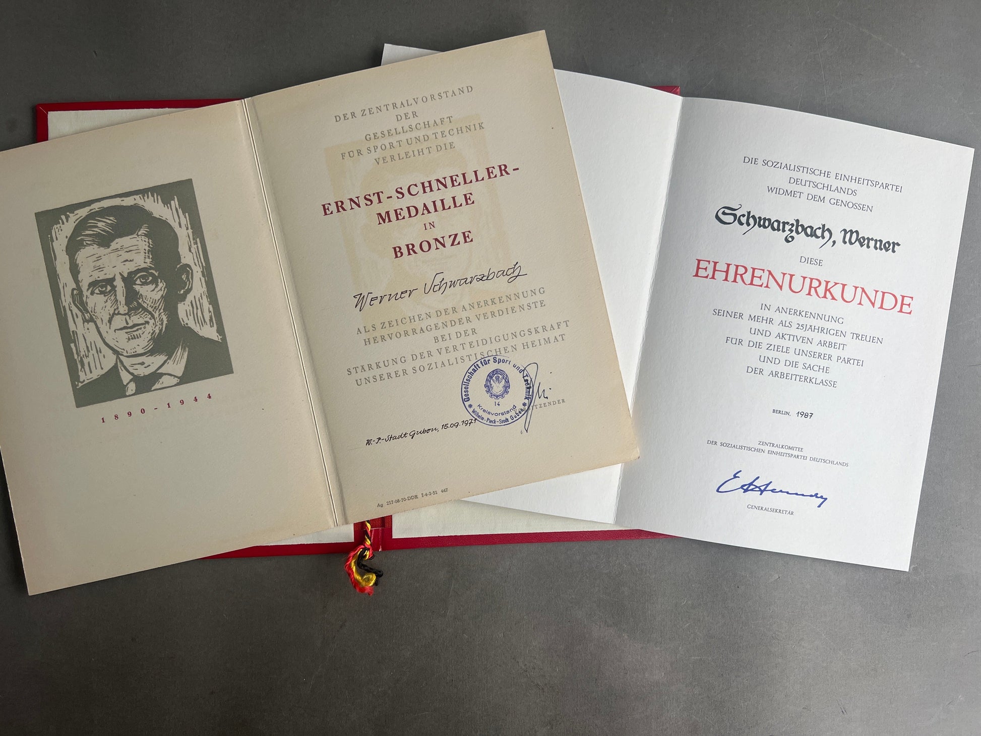 Østtysk DDR Urkunde Mappe med 2 urkunder fra samme mand. Original.
