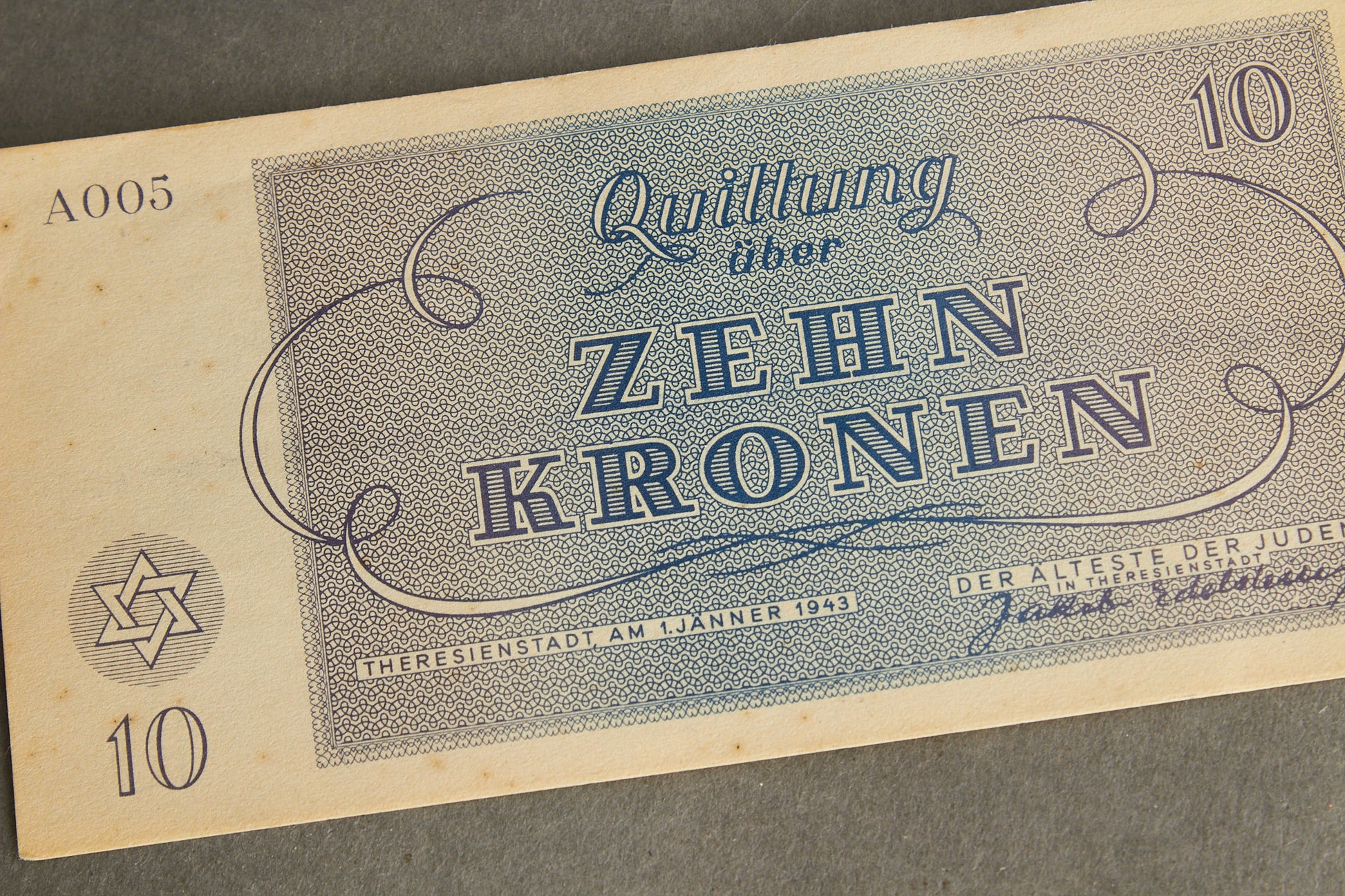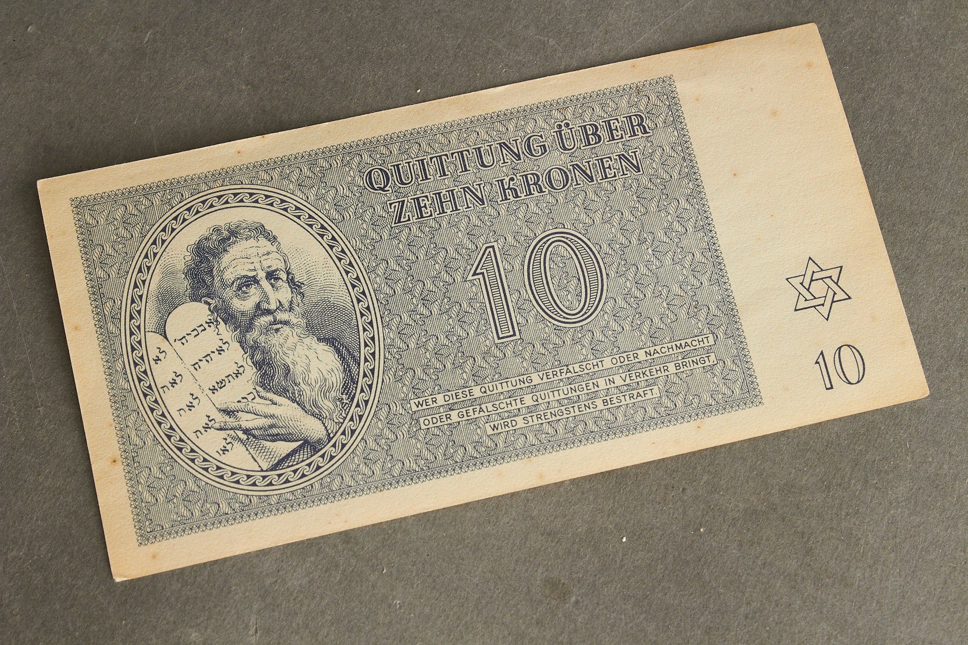 WW2 Tysk Koncentrationslejr "Zehn Kronen" Pengeseddel fra Theresienstadt. Sjælden. Original.