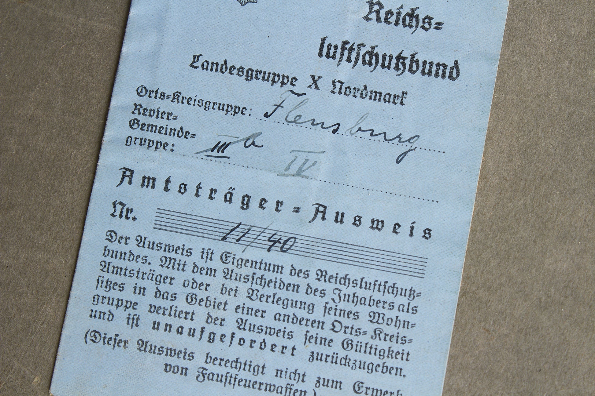 WW2 Tysk Reichs Luftschutzbund "Ausweis" fra Flensborg. Original.