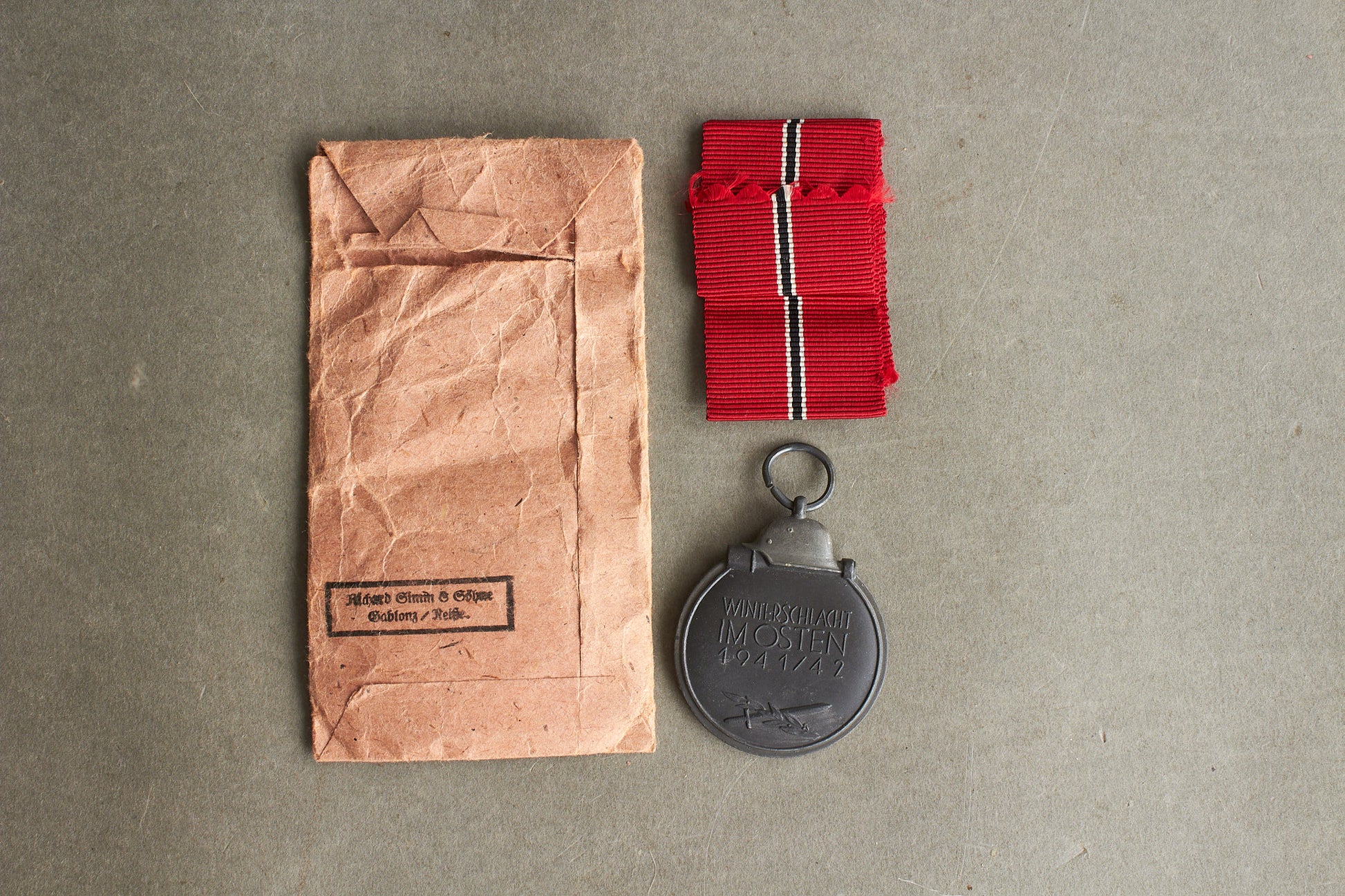 WW2 Tysk Sæt Østfront Medalje i pose. Pose og Medalje fra samme fremstiller. Stemplet "93" for "Richard Simm & Sohne". Original.