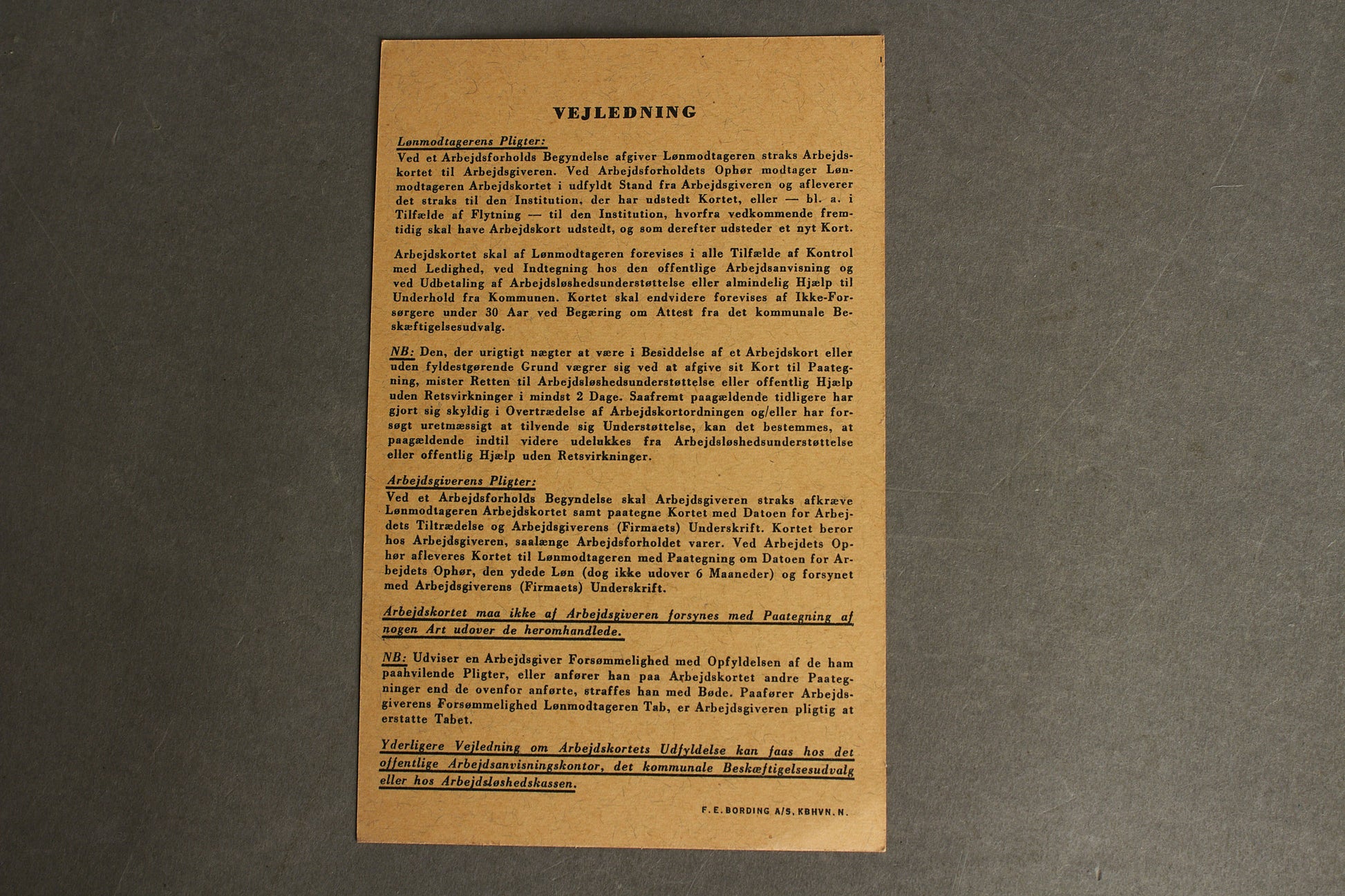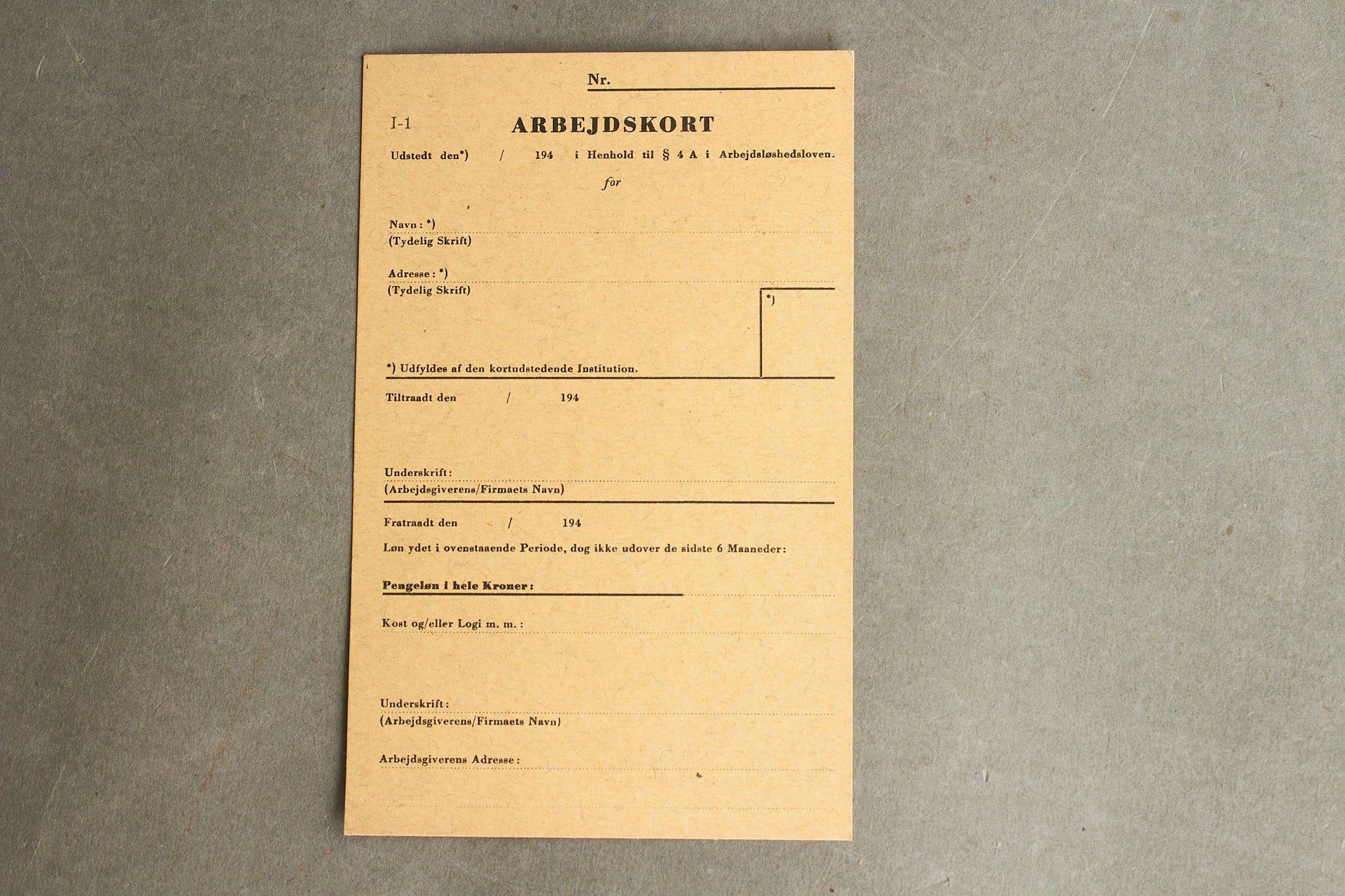 WW2 Dansk Illegalt "Arbejdskort" lavet af Modstandsbevægelsen. Original.