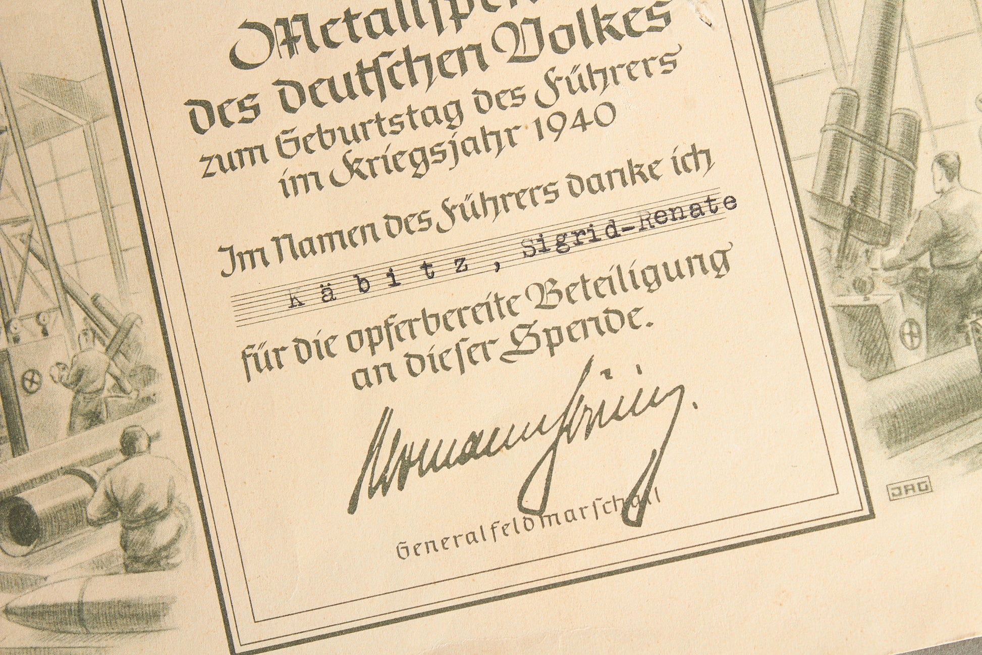 WW2 Tysk "Metallspende" Urkunde (doneret stål til krigsindustrien på AH Fødselsdag). Original.