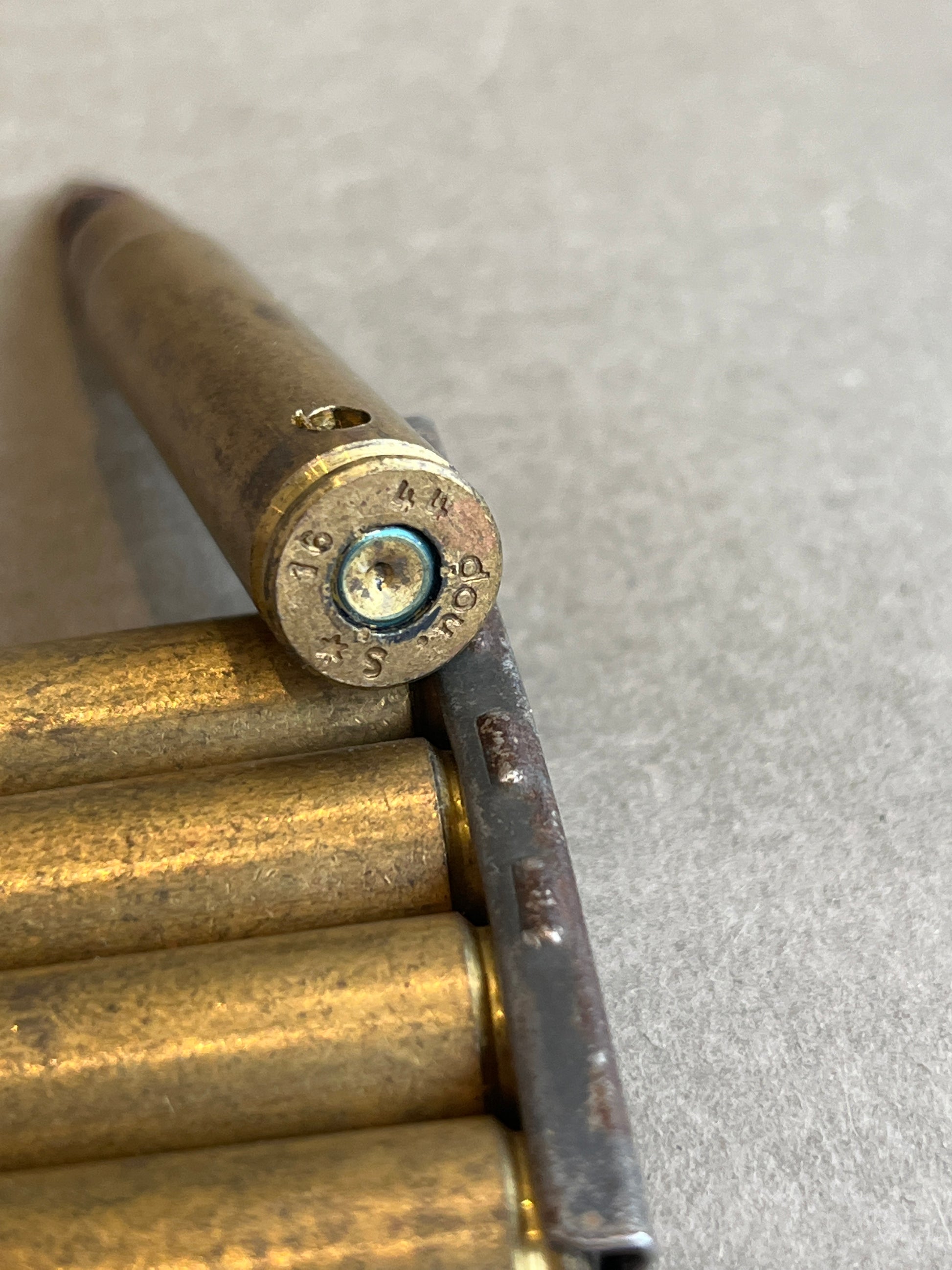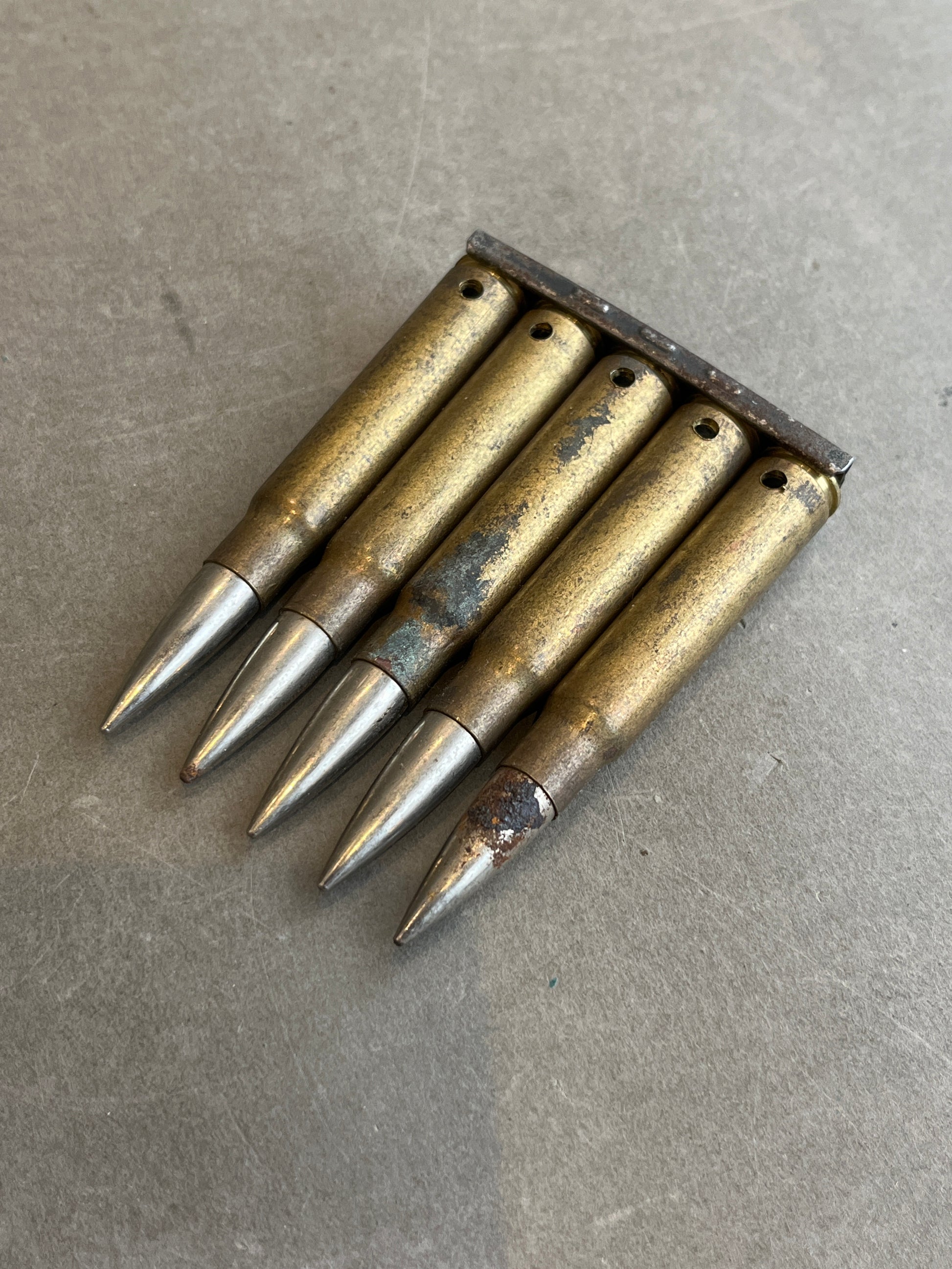 WW2 Tysk K98 patroner i laderamme. Deaktiveret. Original.
