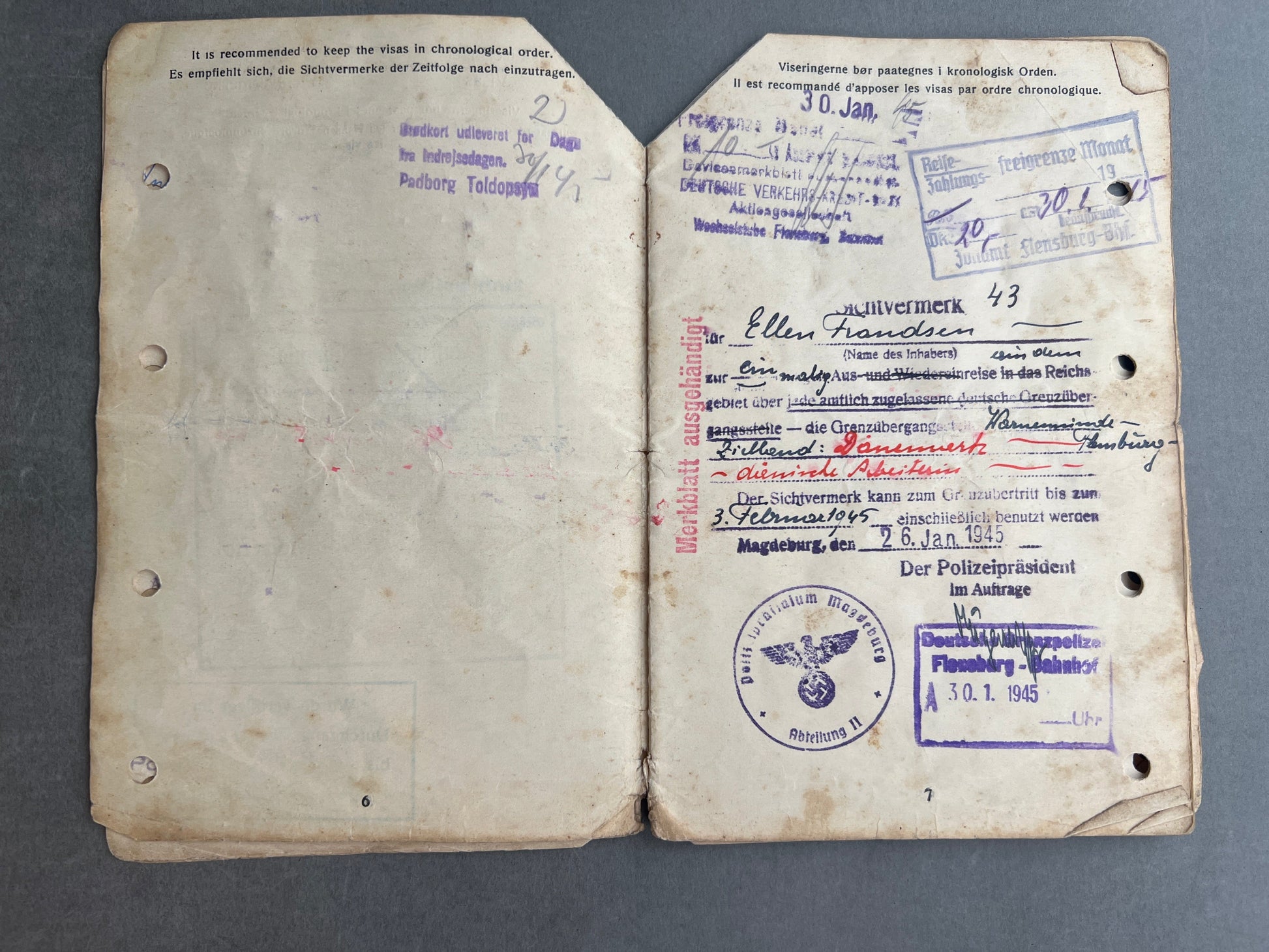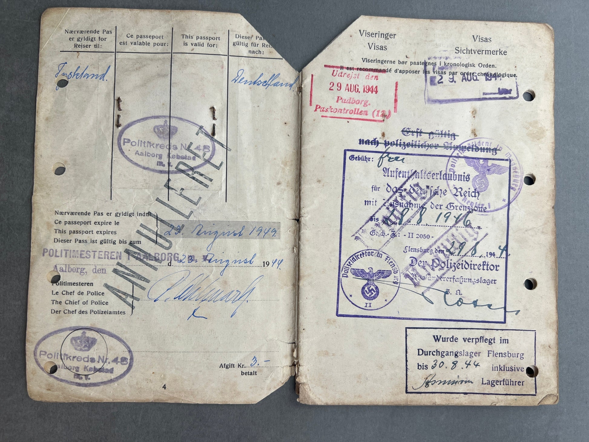 WW2 Dansk Rejsepas med tyske stempler. Original.